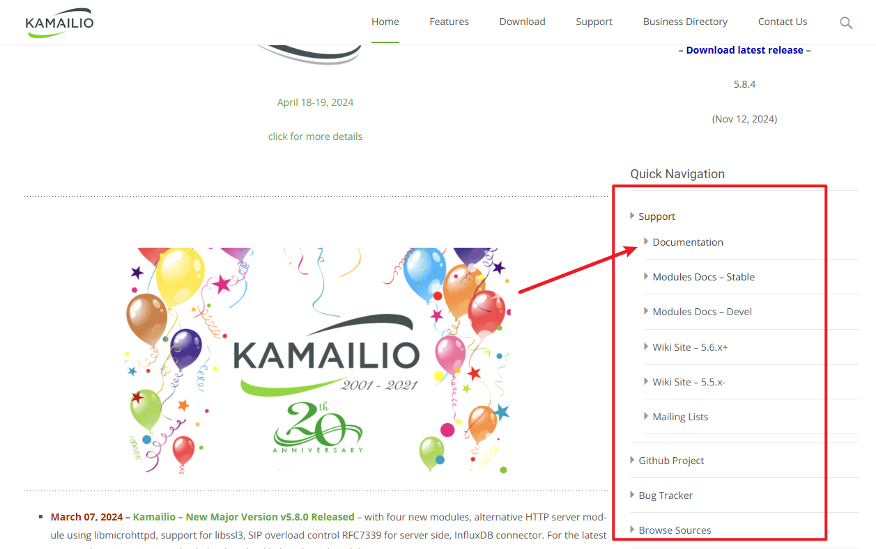 当我们打开Km的官网(kamailio.org)后, 会重定向到https://www.kamailio.org/w/, 在页面的右侧,
