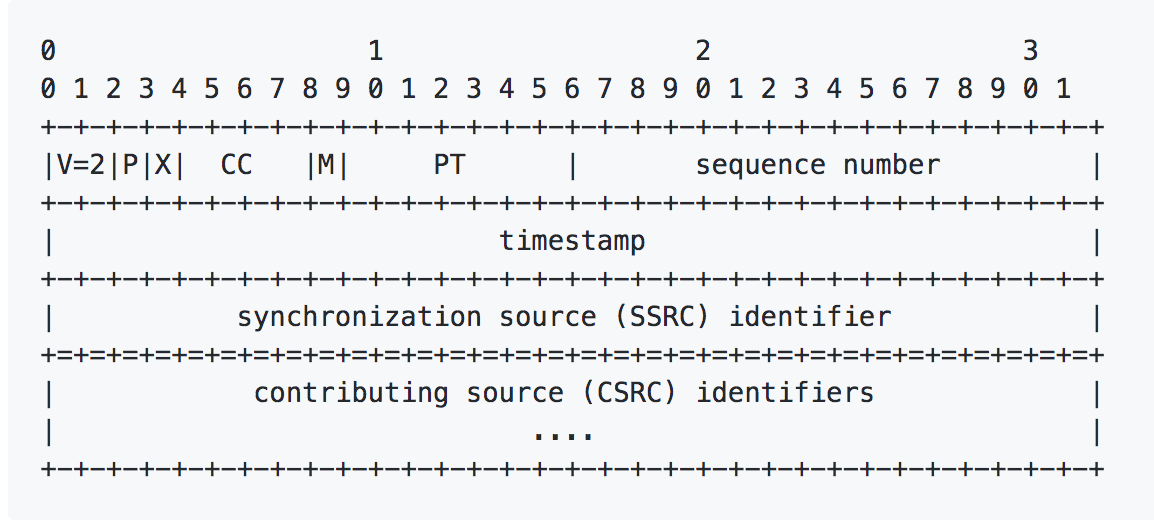 RTP详情 https://www.ietf.org/rfc/rfc3550.txtRTP数据体类型编码表参考 https://www.ietf.org/rfc/rfc3551.txt