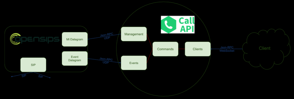 The new Call API project consists of a standalone server able to serve a set of API commands that can be used to control SIP calls (such as start a new call, put a call on hold, transfer it to a different destination, etc.). In order to provide high performance throughput, the server has been developed in Go programming language, and provides a WebSocket interface that is able to handle Json-RPC 2.0 requests and notifies.Although it runs as a standalone daemon able to control calls, it does not directly interact with SIP calls, but just communicates with a SIP proxy that actually provides the SIP stack and intermediates the calls. The first release of the Call API is using OpenSIPS for this purposes, but this is a loose requirement – in the future other SIP stacks can be used, with the appropriate connectors.