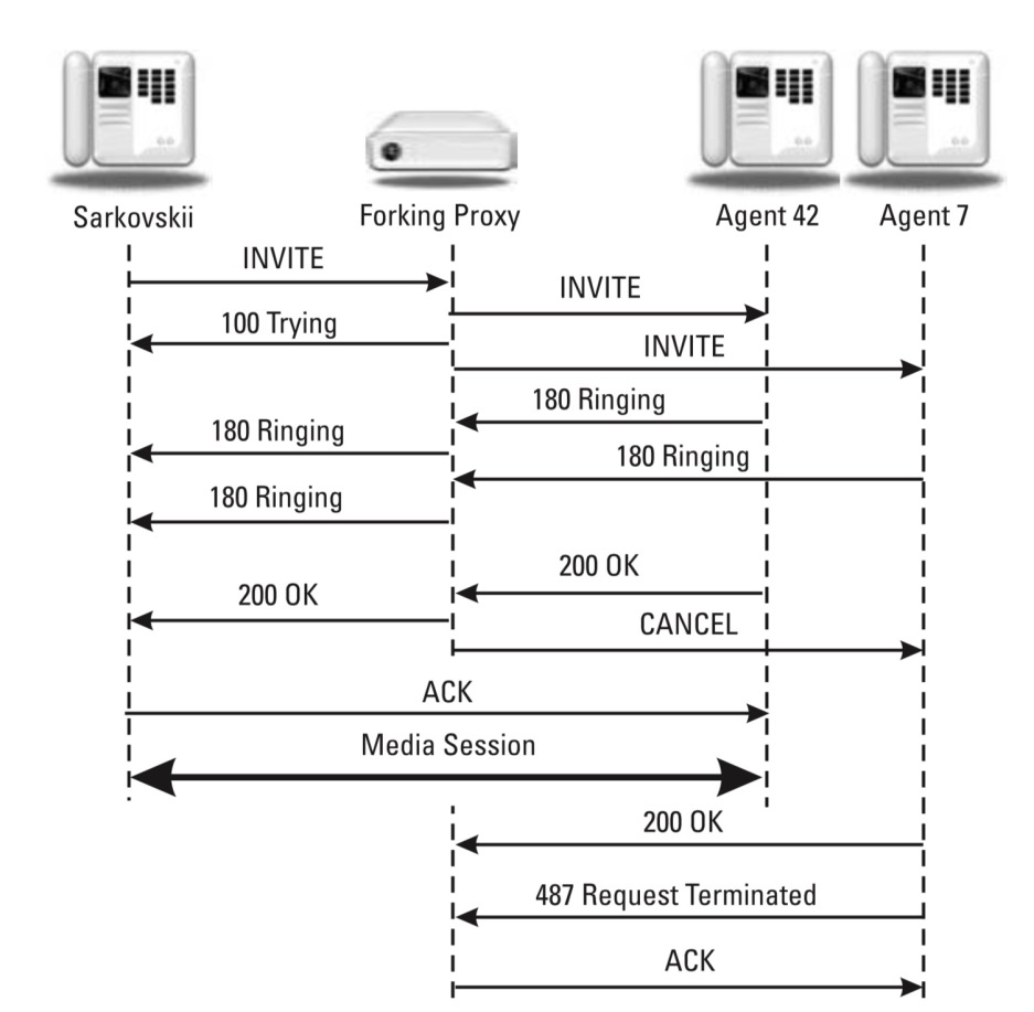 Forking Proxy收到一个INVITE请求,却发出去多个INVITE来呼叫多个UA, 适用于多人会议。