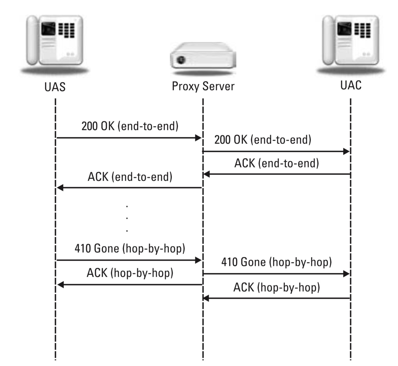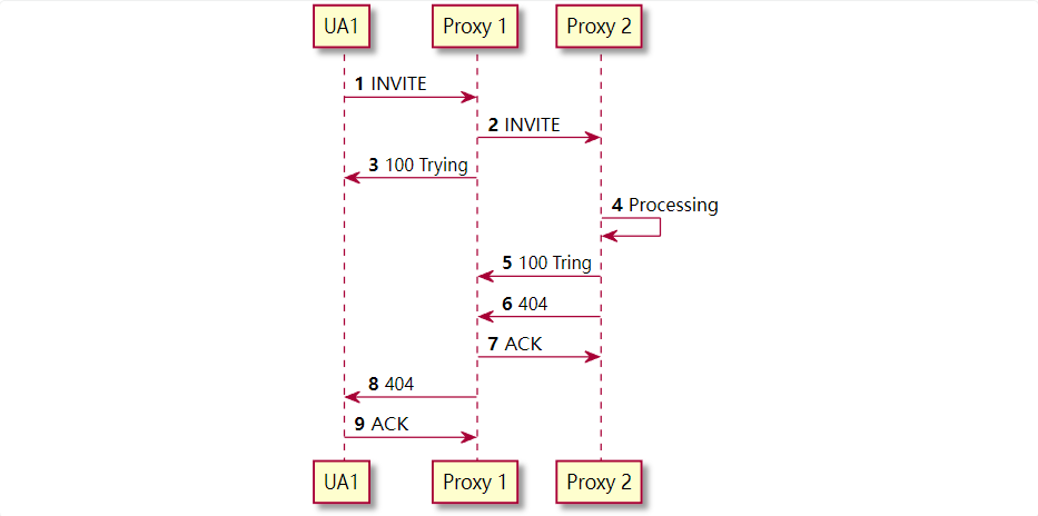 - 3xx, 4xx,5xx,6xx的ACK是逐跳的,并且一般是代理服务器产生