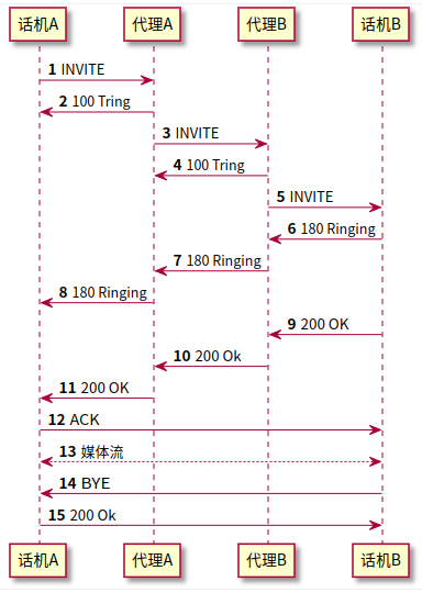 - 从INVITE请求到最终的响应(注意1xx不是最终响应,非1xx的都是最终响应)之间,称为事务。一个事务可以带有多个消息组成,并经过多个ua。