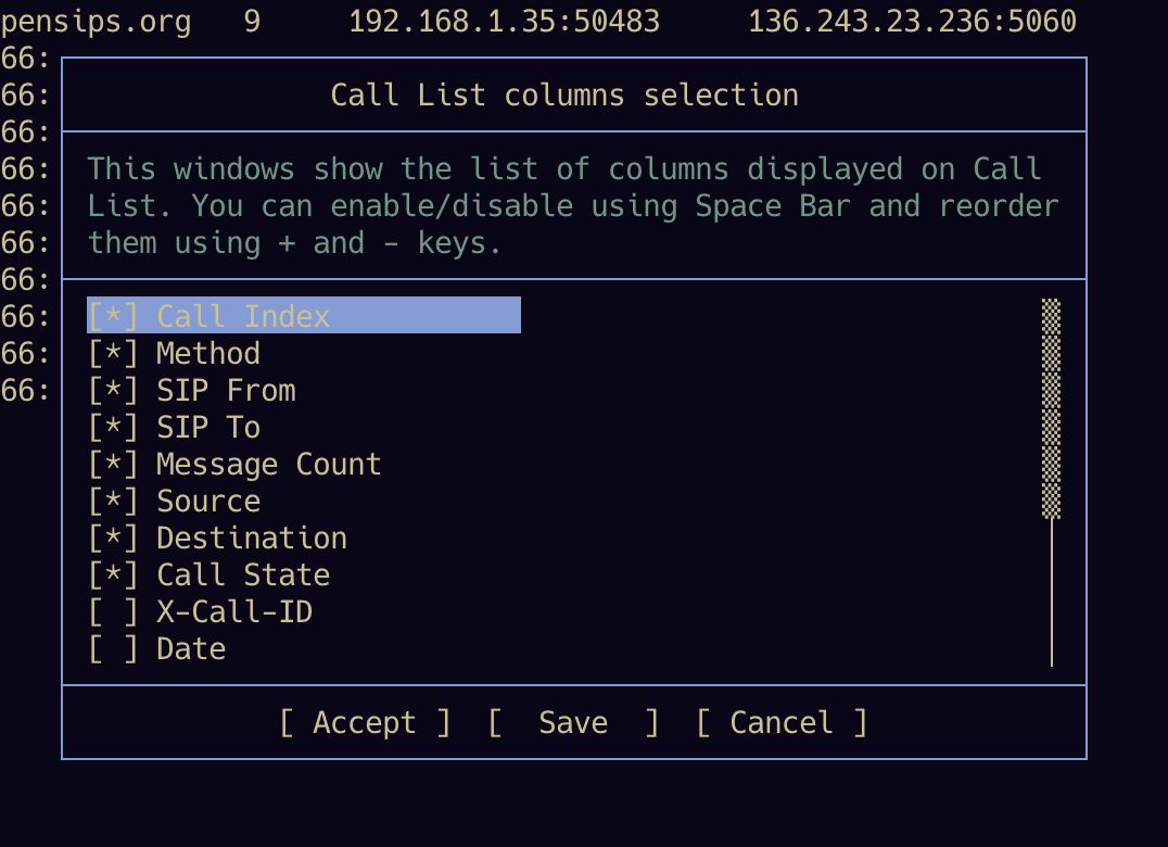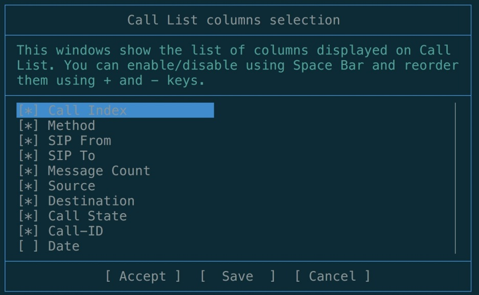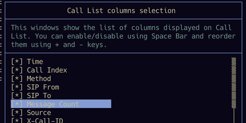- F10 or t: Select displayed columns, 显示或者隐藏侧边sip消息栏