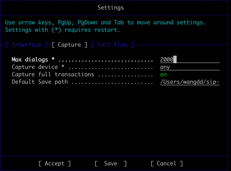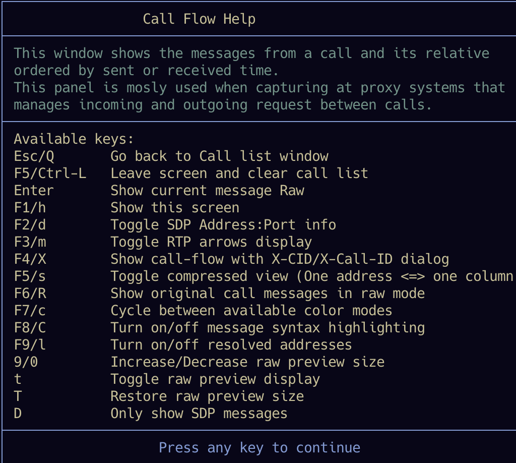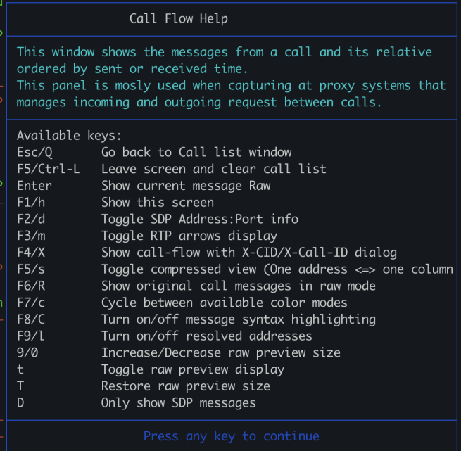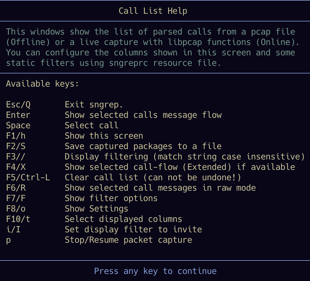 sngrep有四个页面,每个页面都有一些不同的快捷键。