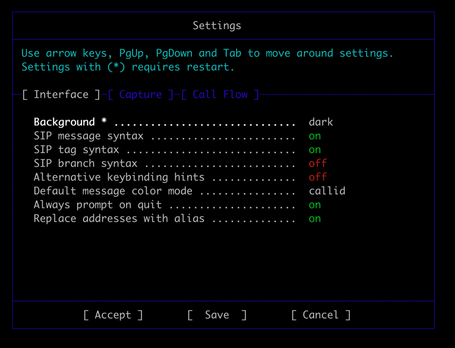 - F7 or c: 改变颜色模式, 有的颜色模式很容易让人无法区分当前查看的sip消息是哪一个,所以需要改变颜色模式
