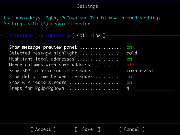 我用的比较多的,可能是Merge Columns witch same addrsss。 sngrep默认用IP:PORT作为时序图中的一个竖线。但是如果IP相同,端口号不同。sngrep就会划出很多竖线。启用了改项之后,就只会根据IP来划竖线。