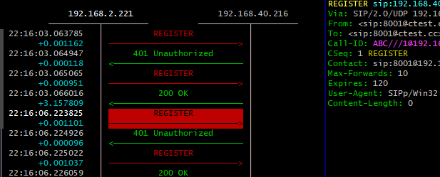 可以很明显的看到,第三个REGISTER的背景色变一大块,所以当前就是在第三个REGISTER信令上。
