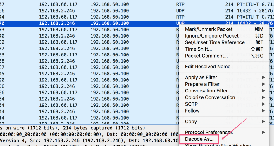 Decode As Udp wireshark 有时候并不能把udp包识别为rtp包,所以这边可能需要手动设置解码方式