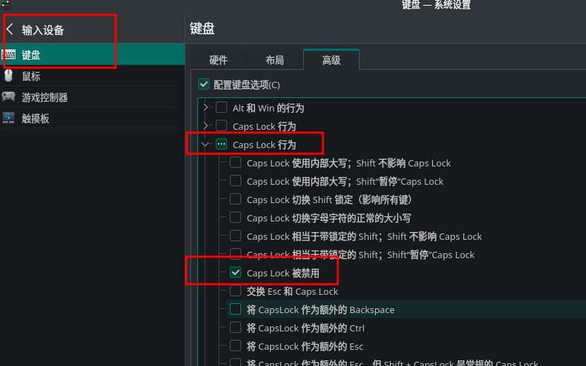 在输入设备中,选择键盘-》高级》 Caps Lock行为, 选中Caps Lock被禁用, 然后应用。