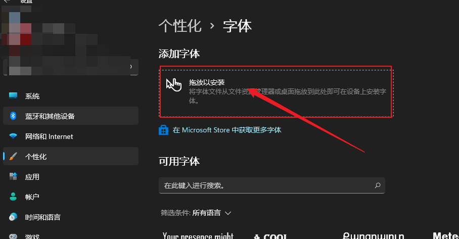 - 打开设置,在个性化》字体中,将之前下载好的所有字体,拖动到下面的红框中,字体就会自动安装