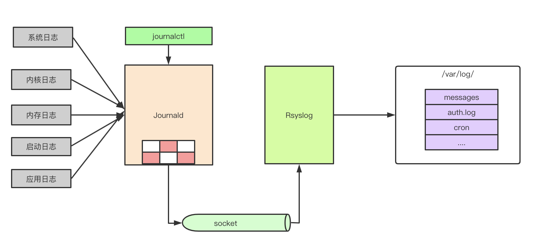 journald会把日志写到一个socket中,rsyslog可以通过这个socket来获取日志,然后去写文件。