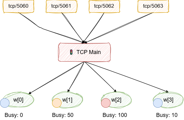 - 选择最小负载的tcp worker进程